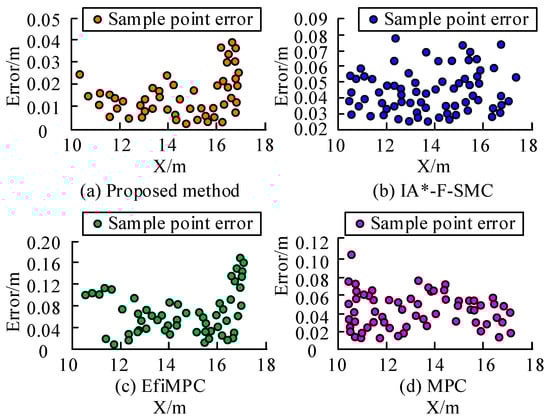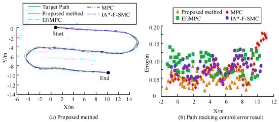 The results in Figure 17 indicate that the proposed method has an average tracking error of 0.039 m, a standard deviation of distance error of 0.028 m, and a maximum error value of no more than 0.04 m during path tracking, demonstrating good path tracking performance. Secondly, the IA *—F-SMC algorithm performed well, with an average tracking error of 0.052 m. The standard deviation of distance error for both the EfiMPC and MPC methods exceeded 0.07 m, and the maximum tracking error values exceeded 0.16 m and 0.10 m, respectively, indicating a significant error margin compared to the proposed method.