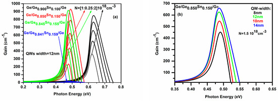 Ge, Sn group-IV-materials have drawn a remarkable amount of interest for both their electronic and optical properties [1,2,3,4]. The optical properties, such as laser and optical gain, can be enhanced when the Ge semiconductor is combined with the semi-metallic α-Sn. Recently, SiGeSn quantum well (QW) structures have shown enormous benefits in both theoretical and experimental studies [5,6,7,8,9,10]. However, significant progress in optoelectronic devices, such as infrared photodetectors in terahertz wavelength regions, has been reported by using GeSn/SiGeSn [11] or by optimization of different structural parameters of SiGeSn [12]. In addition, the optoelectronics properties of SiGeSn are greatly enhanced by the optimization of the α-Sn concentration, in particular by the transition from an indirect to direct band gap [13,14]. However, it is experimentally shown that the direct bandgap structure can be acquired by the incorporation of a small concentration of α-Sn [8], and that a high photoluminescence intensity can be also attained. Indeed, the elaboration and photoluminescence characterization of GeSn has significantly contributed to the growth of Si-based optoelectronics technology [9,13]. Further, several practical investigations demonstrated that the direct bandgap structure of Ge1−xSnx can be obtained with x = 0.12 [15]. In addition, thanks to changing the bandgap of GeSn, the ternary alloy SiGeSn also presents an analogous inter-band transition. Furthermore, several experimental and theoretical studies demonstrated that the ternary alloy SiGeSn has a higher range of bandgap and lattice variation compared with the binary one, therefore providing supplementary applications. An interesting question is related to the threshold carrier densities of GeSn QW laser light emission and the physical cause of low-temperature lasing of current. This has been studied in order to evaluate the threshold carrier densities of habitual III–V and II-VI QW lasers [16]. Indeed, the lasing has been investigated, and it has been shown that optical gain emission behavior analogous to II–VI and III–V QW has been found for GeSn QW by n-type doping of 6 × 1018 cm−3. In addition, a theoretical analysis of GeSn quantum dots for photodetection applications has also been conducted [17].