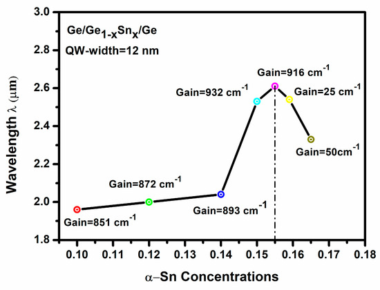 We notice that the optical gain curves are very sensitive to the α-Sn concentration and to the QW-width. The injected carrier density has been chosen to overcome the free carrier absorption losses [6] and it is varied from to . It is important to note that within the 8-band k.p Hamiltonian, the injected carrier density has been varied from to in references [7,16]. One can observe that for the value of x between 0.1 and 0.159, the gain peak moves to a higher wavelength when we increase the Sn concentration, i.e., we reached an emission wavelength of the order of 1.96 μm for x = 0.1, whereas for x = 0.155, an emission value in the order of 2.61 μm was obtained. These results confirm that mid-infrared laser structure operating at room temperature can be obtained by Ge/Ge1−xSnx/Ge QW structure. Otherwise, for x = 0.159, we remarked the strong reduction for optical gain. We reached an intensity lesser than 50 cm−1, whereas for x = 0.155 an intensity in the order of 929 cm−1 has been obtained. Therefore, this variance does not exist in the calculations provided by the 8-band model [2,7]. Furthermore, the 14-band k.p Hamiltonian 0.155 represents the critical concentration of a-Sn, which leads to the strong decrease in the intensity of the optical gain as presented in Figure 4. In order to highlight the evolution of wavelength and the peak gain maximum versus α-Sn concentration, we plotted (in Figure 4) the wavelength extracted from the peak gain maximum as a function of the insertion of the α-Sn contents.