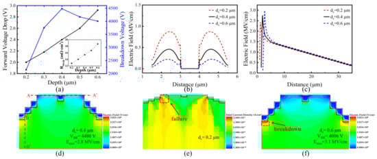 Figure 3a shows the simulated VF and VBR as functions of the step depth of the P+ region of 4H-SiC MST-JBS diodes. The results show that as the ds increases from 0.2 to 0.6 μm, the VF exhibits a linear increase from 2.0 V to 2.92 V. Additionally, as illustrated in the inset of Figure 3a, the Ron,sp increases correspondingly from 12.8 mΩ·cm2 to 18.7 mΩ·cm2. However, the breakdown voltage exhibits a trend of increasing first and then decreasing. Figure 3b shows the distribution of electric field intensity along AA’ in the 4H-SiC MST-JBS diode in Figure 3d. It is obvious that as the ds increases, the breakdown voltage is effectively improved due to the notable reduction in the electric field intensity on both sides of the central P+ region. It is indicated that under a high reverse bias, the depletion layer formed by the shallow depth of the P+ region does not effectively shield the Schottky junction, leading to an excessively high surface electric field. Thus, the ds is 0.2 μm in the 4H-SiC MST-JBS diode, resulting in a breakdown voltage of approximately 2150 V. This is attributed to the increased effect of image forces resulting in a lowering of the effective barrier height, which subsequently promotes more electrons to flow over the lower barrier explained by the thermionic field emission theory. Furthermore, under high electric field conditions, the excessive carriers tunnel through the lowered Schottky barrier. Thus, a combination of thermionic field emission and field emission contributes to reverse leakage currents, which leads to premature breakdown at the central P+ region of the device, as shown in Figure 3e. Figure 3c shows the distribution of electric field intensity along the BB’ as the ds increases. It is found that as the ds further increases, the electric field concentration effect gradually shifts from the device surface towards its interior. The intensified effect observed along the lowest edge of the P+ region in the BB’ direction results in device breakdown, as shown in Figure 3f. Furthermore, when the ds is excessively deep, it causes a decrease in the thickness of the drift layer, which in turn decreases the breakdown voltage. However, when the ds is 0.4 μm, the deep potential barrier shielding layer plays a crucial role in effectively reducing the high surface electric field. Additionally, this appropriate depth design minimizes the loss of drift layer thickness and significantly alleviates the detrimental impact of the electric field concentration effect on device performance under reverse voltage conditions. Therefore, the uniform distribution of electric field within the active region of the 4H-SiC MST-JBS diode can be achieved by adjusting the ds as a key parameter. As a result, in order to achieve higher reverse breakdown voltage and lower forward voltage drop requirements, the optimal ds is determined to be 0.4 μm, resulting in a VBR of 4480 V and a VF of 2.4 V.