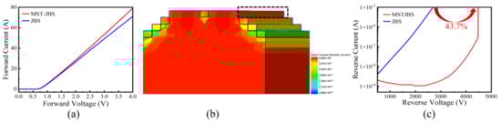 (a) The simulated forward characteristics of JBS and MST-JBS diodes. (b) Current density distribution of a MST-JBS diode. (c) Reverse leakage current of JBS and MST-JBS diodes.
