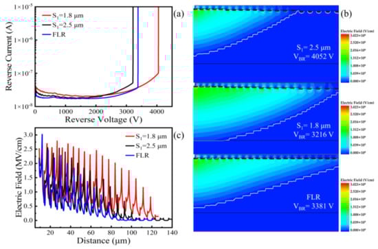 A multi-step trenched linearly graded FLR termination structure is designed and optimized based on simulation, as shown in Figure 1c. For the conventional FLR structure, the breakdown voltage of the termination is highly dependent on the size of the ring spacing. More rings are needed to reduce the electric field peak due to the narrow spacing. Similarly, when the spacing is large, the field-limiting rings fail to expand the depletion layer outward. Therefore, the high electric field at the main junction of the device, caused by the curvature effect, is often not effectively mitigated. The introduction of the MTLG-FLR termination structure results in a much higher protection efficiency. Figure 5a shows the comparison of the reverse I-V characteristics between the MTLG-FLR structure and a conventional FLR structure with a uniform spacing of 2.5 μm. The total length of the FLR is consistent with that of the 1.8 μm S1 of the MTLG-FLR structure. The results indicate that the FLR structure exhibits a reverse breakdown voltage of 3380 V. In contrast, the breakdown voltage of the MTLG-FLR structure is increased by 20% (S1 = 1.8 μm). The increase in breakdown voltage observed in the device can be attributed to the combination of two key factors, including the linear variation in the spacing between FLR and the multi-step trench structure of the termination. Thus, the electric field distribution within the MTLG-FLR terminal region is more uniform.