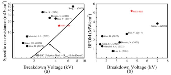 Figure 6 shows a comprehensive comparison of the specific on-resistance and BFOM (BFOM = 4VBR2/Ron-sp) for the device proposed in this paper, as well as the results reported in the references [19,22,23,24,25,26,27]. The detailed performance parameters are also summarized in Table 2. As illustrated in Figure 6a, at a voltage of 4.48 kV, the Ron-sp obtained from theoretical calculations is approximately 10 mΩ·cm2. The results reveal that the MST-JBS structure exhibits a Ron-sp of 15.4 mΩ·cm2, which is notably closer to this theoretical limit value compared to that of other diodes. This indicates that under forward bias, the MST-JBS has the lowest conduction losses, which can reduce energy losses and enhance the overall efficiency of the system. The BFOM reflects the trade-off between the specific on-resistance of the device and its blocking capability. A higher BFOM value signifies that lower on-resistance can be achieved at a specified voltage. The results indicate that the BFOM of the MST-JBS has achieved 5.21 GW/cm2, which is significantly higher than that of other devices. Combining the above results, it is evident that the MST-JBS structure demonstrates remarkable effectiveness in achieving an optimal balance between forward conduction performance and reverse blocking capability. This balance significantly enhances the overall performance of the device, making it a prominent candidate in the field of high voltage devices.