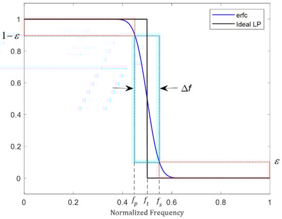 In [35], a low-pass (LP) FIR filter with the complementary Gaussian error function (erfc(.)) is described. As was noted, the graph of the erfc(.) represents a low-pass filter magnitude response, as shown in Figure 1.