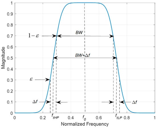 The BP filter bandwidth (BW) is defined at the magnitude response level δ = 1 − ε, as is shown in Figure 2. The obtained magnitude response is maximally flat, smooth, and without oscillations in the stop bands [35,36]. When ε is fixed, the BP filter selectivity depends on the parameter Δf, as shown in (2).