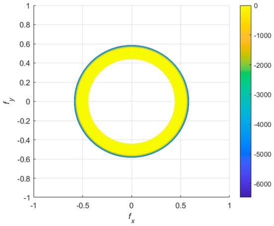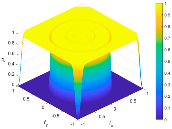 The proposed method produces 2D band-pass filters with extremely high selectivity. For example, in Figure 3 and Figure 4, a magnitude response H in dB of a 2D band-pass circular filter with BW = 0.1, ft = 0.5, β = 385.3394, δ = −3.01 dB, Δf = 1/1000, and a grid size of 1024 × 1024 is shown.