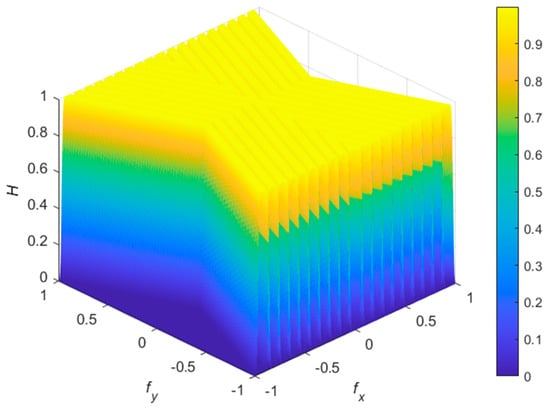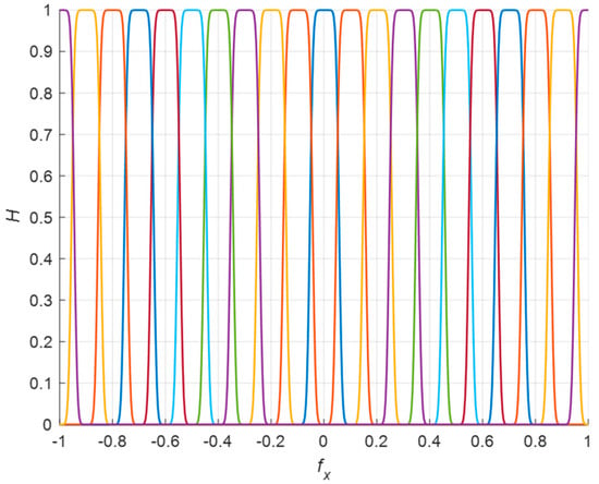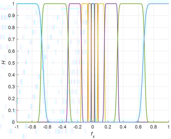 By substituting Equations (10)–(12), we determine the 2D fan filter banks’ magnitude responses, as shown in Figure 7.