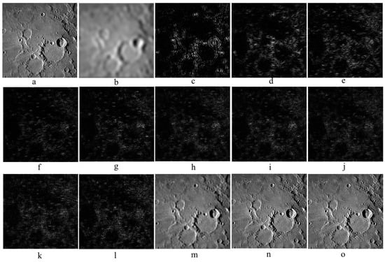 Image analysis with 2D circular uniform filter banks; N = 11: (a) original image “Moon’s surface”; (b) low-pass filtered; (c–k) band-pass filtered with nine uniform BP filter banks; (l) high-pass filtered; (m) recovered image by summing the first two filter banks (b,c); (n) recovered image by summing the first three filter banks (b–d); (o) recovered image by summing the outputs of all filter banks (b–l).