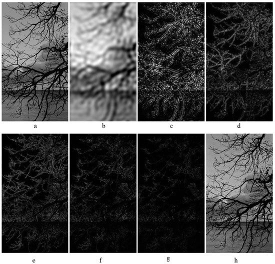 Figure 13a presents a grayscale picture Figure 13a (from Petya Tasheva) with a size of 2048 1152 pixels of a tree branch with the sea and clouds in the background. The picture is decomposed using the six nonlinear filter banks from Example 4: one LP bank Figure 13b, four BP banks Figure 13c–f, and one HP bank Figure 13g. Image processing is performed with the same rules described in the previous example.