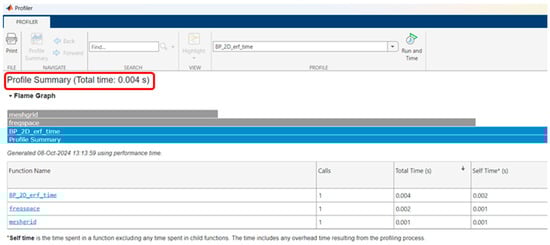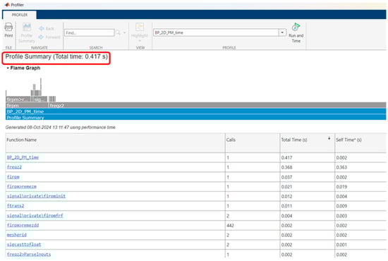 The filter coefficients are determined by equations, which facilitate the design. There are no approximations, optimizations, iterative algorithms, convergences, etc. For example, the coefficients of the 2D BP filter depicted in Figure 3 for 0.03 s is calculated using MATLAB (version R2023a) and the following notebook: DESKTOP-TK312MM Processor Intel(R) Core(TM) i7-7500U CPU @ 2.70 GHz 2.90 GHz, RAM—12.0 GB.
