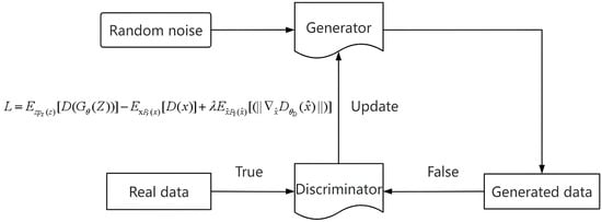 GAN simultaneously trains a generator, which aims to capture data distribution, and a discriminator, which estimates the probability that a given sample comes from real data []. It applies the concept of the zero-sum game from game theory, viewing the generator and discriminator as two competing players. Through a dynamic game process between them, the underlying distribution of real data is analyzed, and a model capable of generating data resembling the real data is constructed. The generator’s goal is to learn the real data distribution and produce samples that closely resemble real ones to evade the discriminator’s detection [,]. During training, the generator learns to improve the quality of generated data such that it becomes indistinguishable from real data for the discriminator. It does this by minimizing the Wasserstein distance between real and generated data distributions. On the other hand, the discriminator’s goal is to determine whether the input data are real or generated, and its output is the probability that the data are real. The discriminator maximizes the Wasserstein distance between real and generated data by assigning lower scores to synthetic samples and higher scores to real samples. The generator and discriminator, both neural networks, are alternately trained to enhance their abilities until the generated samples are indistinguishable from the real ones. The general GAN objective function is shown in the following equation: