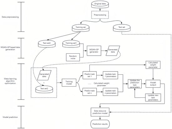The specific process of the data resource pricing prediction method, which combines data augmentation using WGAN-GP and the Reptile algorithm, is shown in Figure 3. First, the processed existing data resource features and prices are input into the generator to enrich the training dataset and enhance the model’s generalization ability. Next, the data resource features generated by the generator are combined with real data resource features and input into the discriminator for evaluation. If the discriminator can correctly distinguish between the real and generated data resource, the generator is encouraged to produce more realistic data. If the discriminator fails to distinguish them, the final data resource features are obtained as output.