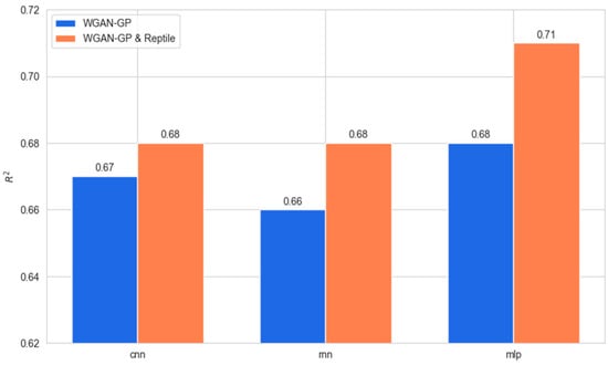 The R2 comparison results before and after model optimization are shown in Figure 5. The prediction performance of all models improved after optimization with the Reptile algorithm, although the degree of improvement varied. Specifically, the Reptile algorithm improved the CNN model by only 0.11%, this may be because CNN models typically contain a large number of parameters and complex convolutional operations. Simply improving the initialization parameters has a relatively limited impact on performance since CNNs rely more on fine feature extraction and deep structure optimization with multiple layers of convolutions. Reptile’s global optimization effect may not fully leverage its advantages in this context. The RNN models have fewer parameters, by 2.54% compared to CNNs, and their architecture is more sensitive to the initialization of parameters. The Reptile algorithm improves parameter initialization, enabling RNNs to better adapt to the variations in sequential data, thereby enhancing performance on small-sample datasets. And the MLP model saw the most significant improvement, reaching 4.12%. The MLP model has a relatively simple structure and fewer parameters. In this case, the Reptile algorithm can significantly improve the initialization parameters, allowing the model to better adapt to small-sample tasks. Without many layers of deep networks, the performance of MLP is more easily influenced by the positive impact of meta-learning optimization.