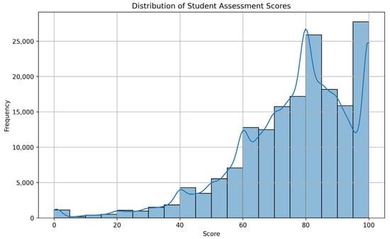 Figure 2 provides an overview of assessment scores revealing a nuanced picture of academic performance. A substantial concentration of scores corresponds to a range of moderately high to high marks. The presence of peaks around certain score ranges could imply that some assessments have a common level of difficulty, leading to clusters of similar scores.