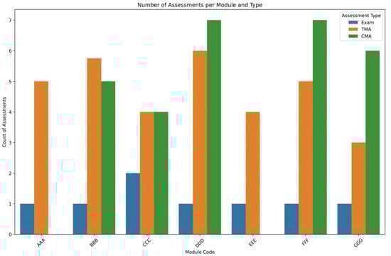 Following the analysis of student assessment scores, attention is put to the types and frequency of assessments conducted across different modules, as illustrated in