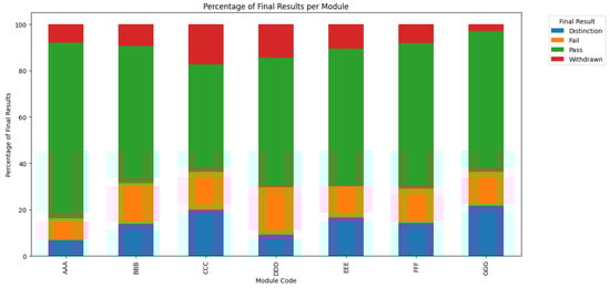 Figure 4 shows the outcome of students’ assessment in terms of percentage among four categories, including ‘Pass’, ‘Fail’, ‘Withdrawn’, and ‘Distinction’. The percentage-based approach of this chart allows for an equitable comparison regardless of the size of the student cohort in each module. For example, the module CCC shows a substantial percentage of ‘Distinction’ results. However, it also shows a significant percentage of ‘Fail’ results, indicating a polarized outcome where students either performed exceptionally good or very bad. The module GGG has the lowest ‘Fail’ results, suggesting not only high performance but also that the assessments may be well-aligned with the students’ capabilities or interests. In contrast, modules AAA, BBB, and FFF show an acceptable percentage of students in each category, which indicates an intermediate difficulty in content and educational methodologies.