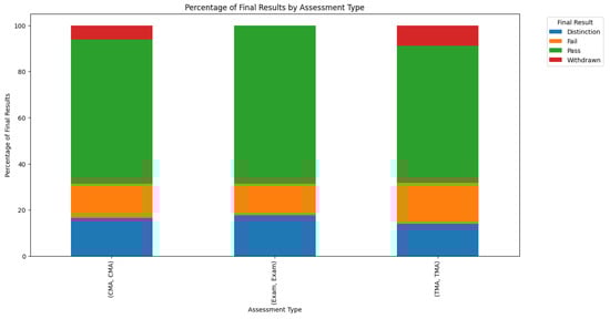 Figure 5 illustrates the relationship between assessment types and student outcomes. A balanced distribution can be observed in both the CMA and TMA while there is a notable proportion of ‘Withdrawn’ in TMA. This result may indicate the demanding nature of such assessments.