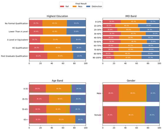 Figure 6. Interestingly, students aged between 35 and 55 exhibit a more favorable performance, with fewer withdrawals and a higher count of ‘pass’ and ‘distinction’ outcomes, compared to the 0–35 age band.