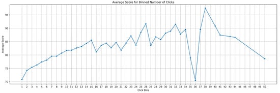 Figure 7. The chart shows average scores against binned click ranges. Amongst the observed patterns, a salient trend is the initial increase in average scores with higher click counts, indicative of a positive relationship between engagement and performance up to a certain threshold.