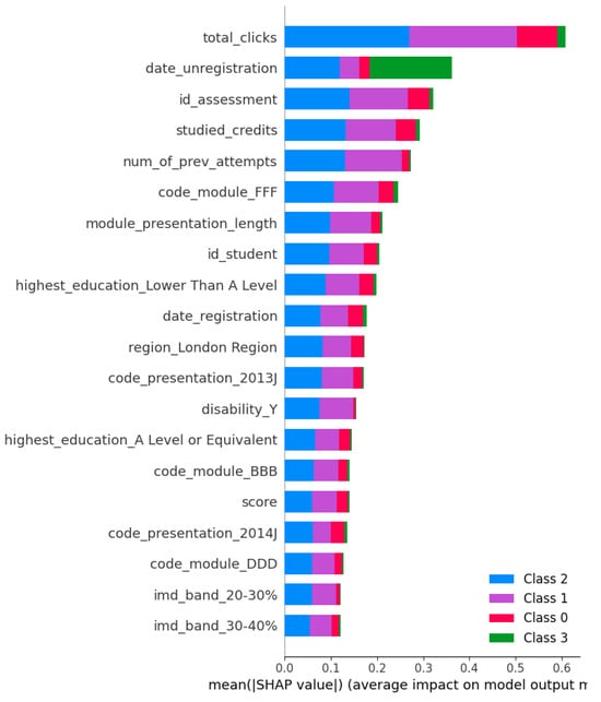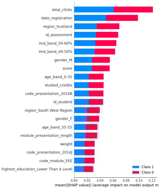 Figure 14. The illustration reveals that ‘Total Clicks’ in the virtual learning environment (VLE) was the most influential feature, with higher interaction levels strongly associated with increased probabilities of classifying a student as likely to succeed. Conversely, ‘date unregistration’ was a significant negative predictor, where an unregistration event could suggest a decreased likelihood of course completion, thereby predicting failure.