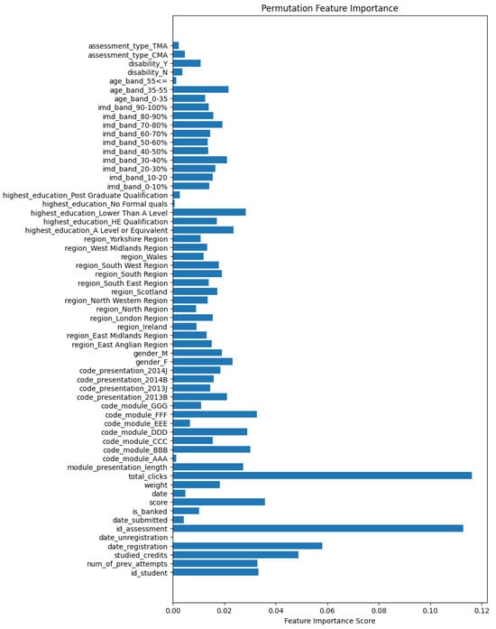 Figure 15 illustrates the permutation feature importance derived from the grade classification model ranking the influence of various features on the model’s output. The “Total Clicks” feature has the highest importance score, suggesting that the student engaging with the material receives the highest scores. Following in significance is the ‘id_assessment’ feature; each assignment has a different average score, which is why assignment ID is important. And when a student enrolls in courses with assignments that people normally do not receive good scores on, it increases the student’s chances to fail.