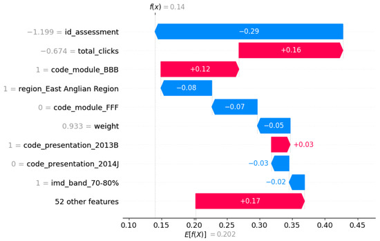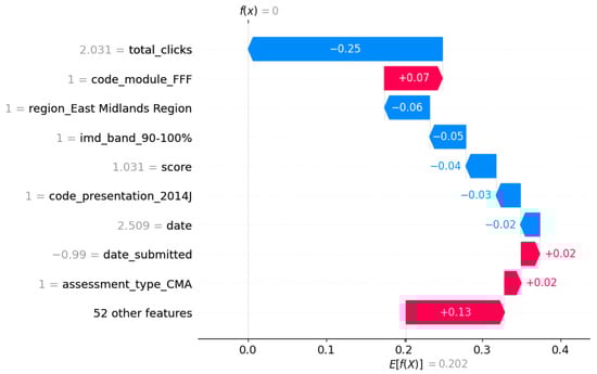 Figure 16 provides representations of SHAP values for an instance within the dataset, illustrating the contribution of each feature to the model’s prediction. As shown, the ‘id_assessment’ feature significantly decreases the model’s output, while ‘total_clicks’ also decreases it but to a lesser extent.