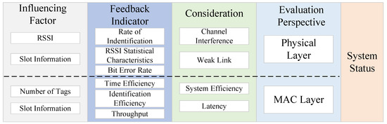 As shown in Figure 1, this paper provides a comprehensive assessment of the RFID system status from both the physical and MAC layer perspectives. The physical layer analysis focuses on the fluctuation of the channel interference and link quality, which are significantly reflected in the statistical characteristics of an RSSI (Received Signal Strength Indicator). The MAC layer analysis mainly focuses on the impact of the real-time adjustment of air interface parameters on the system status, which are reflected in the key performance indicators, such as time efficiency, identification efficiency, and throughput. Through this multi-dimensional analysis, this paper aims to provide a theoretical basis for the status evaluation and parameter optimization of RFID systems.