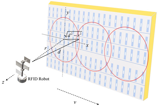 In dynamic scenarios, RFID systems can be piggybacked on mobile robots for identification. As the robot moves, the identification range of the reader is constantly moving. As shown in Figure 2, the archive shelf evenly distributes a number of RFID tags that are attached to the file. The reader at speed v is in front of the archive shelf mobile scanning, with the movement of the reader constantly having the old tag leaving the identification area and the new tag moving into the identification area.