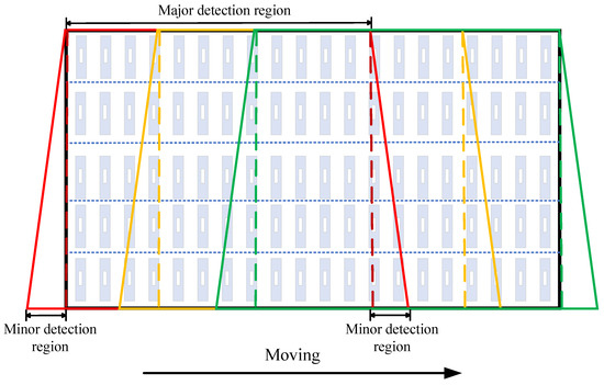 The effective scanning area of the reader can be categorized into primary and secondary detection regions. In the primary detection region, the probability that most tags can be detected is close to 100%, while in the secondary detection region, the probability that tags are detected is negligible [17]. Therefore, in this paper, the reader identification range is specified as the rectangular region formed by the two dashed lines in Figure 3, i.e., the primary detection region, ignoring the identification of tags on both sides.