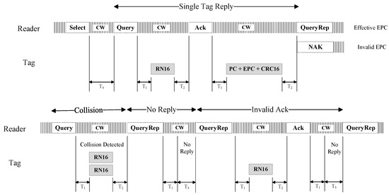 Figure 4 is a link sequence diagram that illustrates the interaction between the reader and the tag. The reader and the tag communicate within the frame slots using commands, such as Query, QueryAdjust, QueryRepeat, and ACK. Depending on the number of tags interacting with the reader within a slot, the frame slots can be classified into three types, idle slot (no tag responds within the slot), successful slot (one tag responds within the slot), and collision slot (multiple tags respond within the slot), as shown in Figure 5.