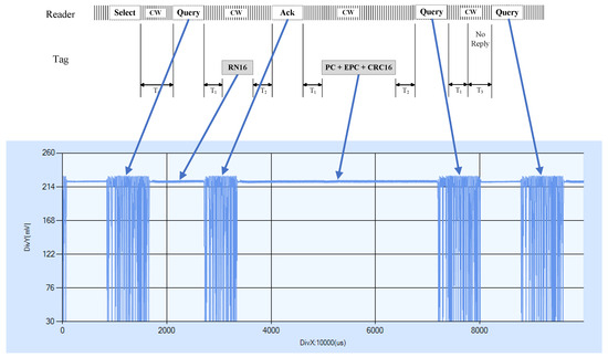 The interaction process between the reader and the tag captured using a spectrum analyzer is shown in Figure 6.