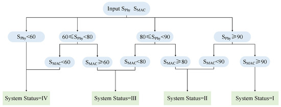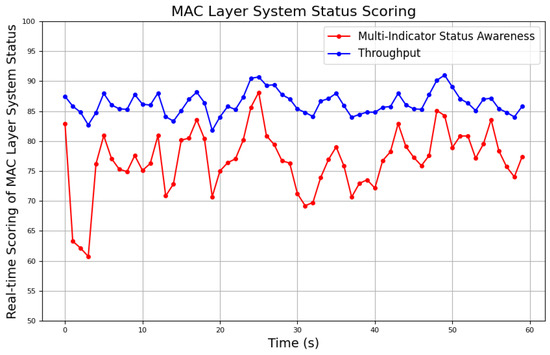 Figure 11 illustrates the comparison between the real-time throughput and MAC layer system status during the 60 s movement of the RFID robot. It can be observed that the throughput fluctuations of the RFID robot remain relatively stable during movement, making it difficult to intuitively reflect the instantaneous changes in the system status. In contrast, the multi-indicator integrated system status sensing model can provide a finer granularity, clearly revealing the dynamic changes in the MAC layer system status. This indicates that the multi-indicator system status sensing model is more aligned with the actual evaluation and decision-making process, offering more accurate evaluation results.