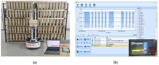 The test scenario is set up in a spacious indoor environment. The archive shelf has five levels, with a length of 2.5 m, a height of 2 m, and a shelf height of 0.4 m. A total of 100 archive boxes, each randomly placed on the shelf, are affixed with 900 MHz UHF passive RFID tags on their sides. The choice of these tags and the reader is based on their common use and performance in industrial applications. A mobile robot (Water robot) equipped with an Impinj SpeedWay Reader and a 9 dBi circularly polarized antenna moves parallel to the archive shelf at different speeds to perform tag identification tests.