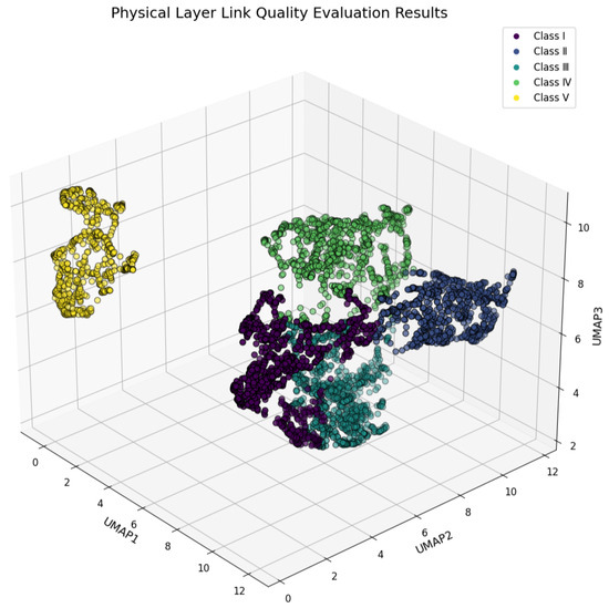 The dataset used for evaluating the physical layer link quality consists of nonlinear, high-dimensional data. To improve the efficiency of the data analysis and the accuracy of its structure, this paper adopts the nonlinear dimensionality reduction algorithm UMAP to perform dimensionality reduction, extracting three link feature parameters. Furthermore, the K-Means algorithm is used to cluster these link feature parameters, and the entropy weight method is applied to calculate the weights of various indicators. The clusters are then weighted and ranked, dividing the link quality into five levels, ranging from Level I (best) to Level V (worst). The weightings of the various indicators are shown in Table 6, while the weight distribution of variance, kurtosis, and skewness in the signal strength under the LQVI is shown in Table 7. The clustering results are depicted in Figure 12. The average silhouette coefficient is 0.70184, indicating high cohesion and separation, with clear cluster boundaries and good clustering performance.