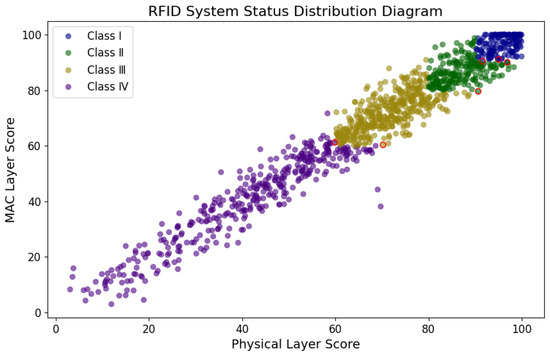 The system status scores of the physical layer and MAC layer are integrated into a new dataset as input for the CART algorithm to classify the RFID system status. The input data are split into a training set and a test set in a 7:3 ratio, and the CART algorithm is used for evaluation. The results are shown in Table 9. The sample distribution is shown in Figure 13, where red markings indicate misclassified samples.
