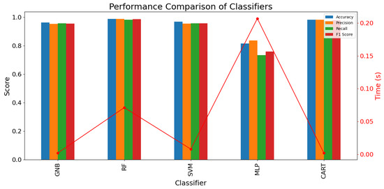 This paper selects the Support Vector Machine (SVM), Random Forest (RF), Gaussian Naive Bayes (GNB), and Multilayer Perceptron (MLP) algorithms to compare with the status evaluation method of an RFID system based on CART. Classification accuracy and algorithm running time are used as performance evaluation criteria. The same dataset is used to train the aforementioned algorithm models, and 1000 test set samples are used for classification. The performance comparison of different algorithms is shown in Figure 14, and the classification accuracy and running time are presented in Table 11. The results show that the RFID system status evaluation method based on CART has a shorter running time and higher classification accuracy.