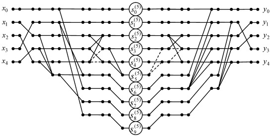To process the matrix we use the expressions for calculating the entries of a circular convolution matrix for N = 3 (Equation (11)) [28,29]. Taking into account the properties of structural matrices [28,29], the computational procedure for the five-point DCT-V is represented by the matrix–vector procedure