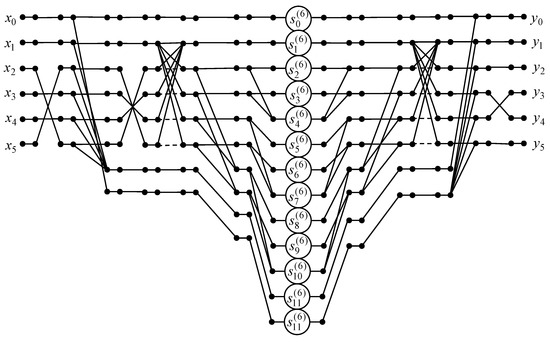 A data-flow graph of the proposed algorithm of the six-point DCT-V is presented in Figure 5. We are able to reduce the number of multiplication operations from 36 to 13, but the number of addition operations is increased from 30 to 41.