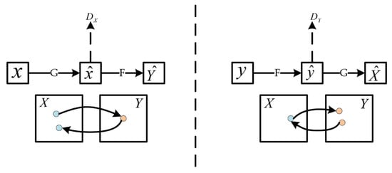Similarly, for the mapping relationship , the adversarial loss is defined as in Equation (2) and is denoted by . Its variable meaning is consistent with the above equation. Here is used to distinguish and :