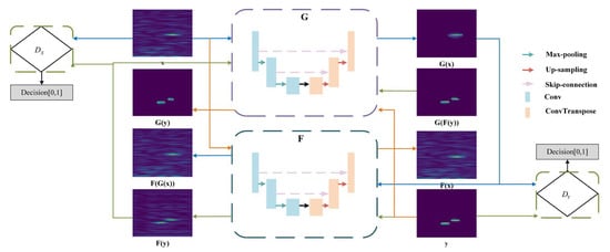 The architecture of CycleGAN comprises two generators and two discriminators, specifically designed as generator , generator and discriminators and . During the training phase, the dataset is partitioned into a source domain dataset and a target domain dataset . These distinct datasets serve as inputs to generators and , respectively. In this context, the generators function as mapping functions within the network. and share an identical structure while learning two mappings: and , respectively. At the same time, the discriminators and also maintain the same structure. The primary function of the discriminators is to determine whether the input image originates from the generator or a real image from the dataset.