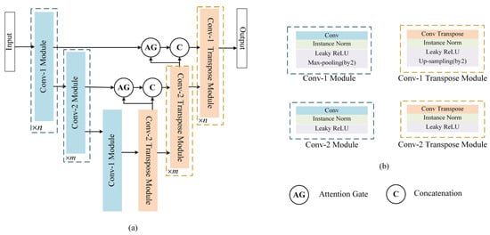Architecture of generator. Sub-figure (a) is the complete structure of the generator. Sub-figure (b) is the different modules that make up the generator. Conv denotes the convolution layer; Instance Norm represents the normalization of a single graph; Leaky ReLU, Tanh represents the activation function; Conv Transpose represents the transposed convolutional layer; the left half represents the main feature extraction, the right half represents the enhanced feature extraction; AG represents the attention gate; C represents the skip connection.
