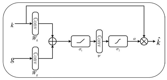 Moreover, there is the phenomenon of overlap between the target and the clutter during the data acquisition process. This phenomenon leads to the inclusion of redundant information in the generator’s output image and results in a distortion of the target response. In order to make the generator focus on the region of interest of the target when extracting features, an attention gate (AG) [23] is introduced in this paper. The architecture of the attention gate is illustrated in Figure 4.