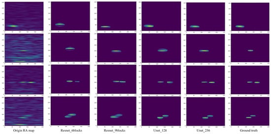 Clutter suppression results under different model. The first column shows the original RA maps, the last column shows the ground truth, and the middle four columns show the test results under different models.