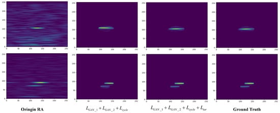 In order to prevent the complex model from leading to training overfitting, we introduce an additional loss to the original loss function to avoid this problem. In particular, we encourage target consistency between inputs and outputs by introducing an additional loss that preserves the original target information more completely. We visualize the test results of the method based on the unet_256 model with different losses, as shown in Figure 10. It can be seen that the object of clutter suppression is closer to the object in the original RA map after the introduction of the additional loss.