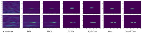 The suppression performance of different methods based on the public CRUW dataset are shown in Figure 11, in order to make comparisons with the traditional clutter suppression method and other deep learning-based methods. In this paper, the clutter suppression results based on the traditional methods with SVD [33] and RPCA [9] are reproduced, respectively. The clutter suppression results based on the deep learning methods with Pix2Pix [34] and CycleGAN are reproduced, respectively. The first column is the suppression result of the original cluttered RA image. The second column is the suppression result of SVD. The third column is the suppression result of RPCA. The fourth column is the suppression result of Pix2Pix. The fifth column is the suppression result of CycleGAN. The last column is the suppression result of the method proposed in this paper.