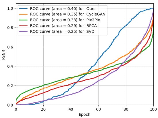 The ROC curve of different methods. The x-axis is by epoch, and the y-axis represents the value of PSNR.