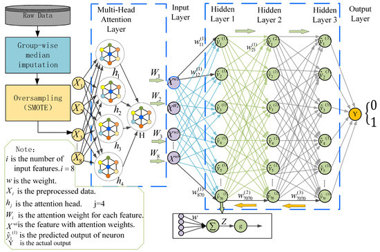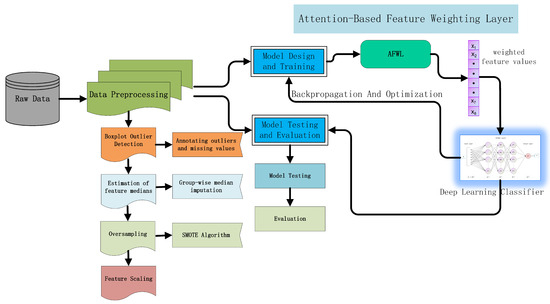 The system comprises several stages, including data collection, data preprocessing, model design and training, optimization, and model testing and evaluation, as shown in Figure 2. To address missing values and outliers in the dataset, we adopted median imputation. This method is suitable for continuous numerical features and is robust to outliers. In addition, we employ oversampling techniques, specifically the SMOTE algorithm, to address data imbalance. Subsequently, feature normalization is performed to ensure that different features have roughly equal influence on the model.