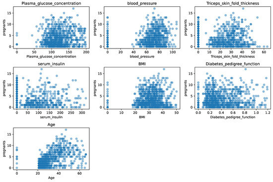 Scatter plots allow for the intuitive identification of data anomalies, as shown in Figure 4, enabling targeted attention to these outliers during data imputation. For instance, as observed from the scatter plots, some data points for plasma glucose concentration are zero, which can be considered as omissions due to human error during data collection. Additionally, triceps skinfold thickness values of 99 are evident, which far exceed the normal range and are likely recording errors.