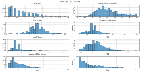 The following validation demonstrates this point well. Histograms of the original data and the group median-imputed data are plotted to fully show the characteristics of the data distribution, as shown in Figure 5 and Figure 6.