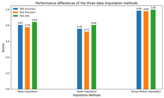 The following Figure 7 and Figure 8 intuitively demonstrates the different predictive performances of the dataset under the same algorithm after applying three different data imputation methods. As can be seen from the figure, mode imputation yields the poorest results, with a test accuracy of only 75.5%. Mean imputation achieves a test accuracy of 80.5%, while median imputation outperforms the others with a test accuracy of 98.35%.
